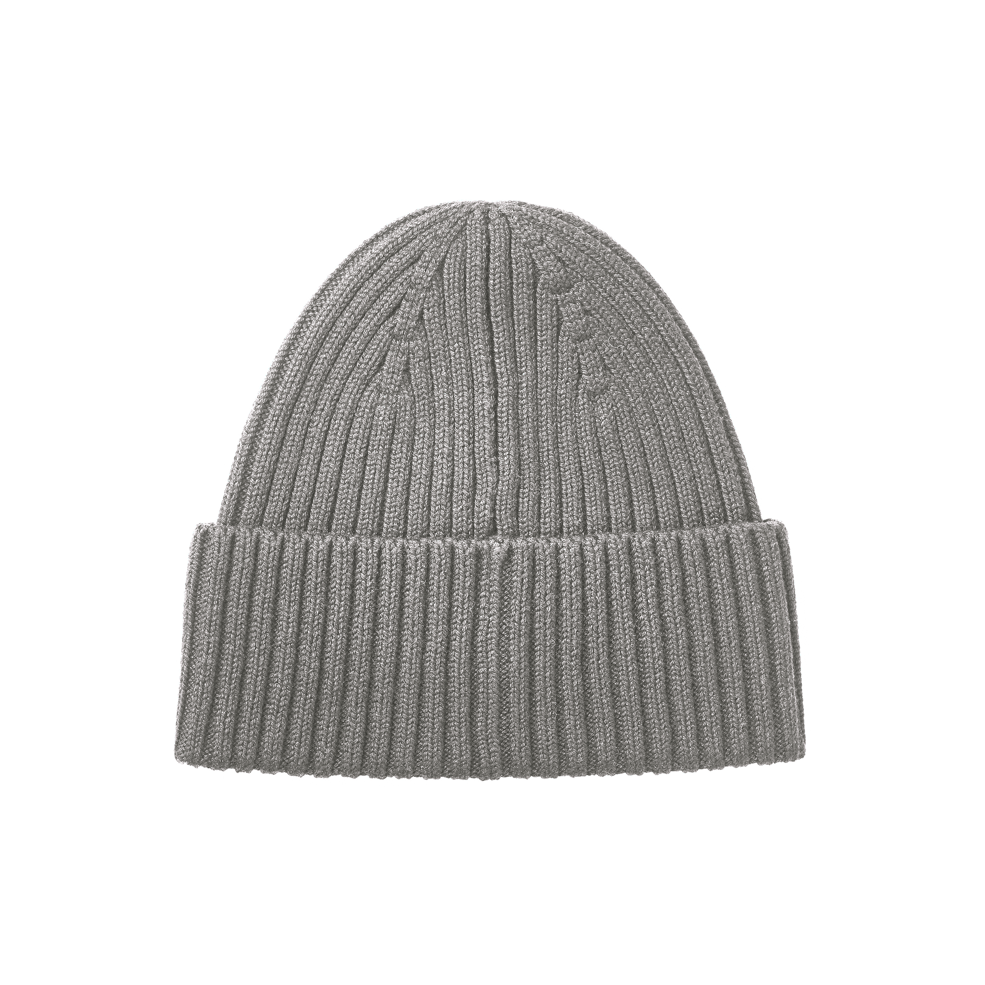 A chunky rib cotton beanie, inspired by a classic fisherman beanie, with a recycled 9x9cm label on the front. The beanie has a turn-up fold with four stitches on each side so the fold stays in place. The label is attached with zig zag stitch for extra security and we've added a little bit of elastane in the composition to help retain its size and fit. Available in one size and a three colourways